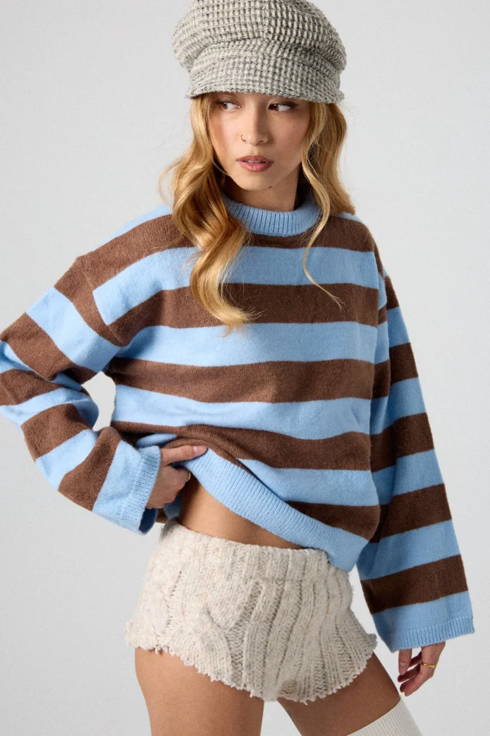 Le bleu ciel supporte très bien l’écru et le blanc cassé par son association nette, lisible, propre. Avec du caramel ou du brun tabac (comme ce pull rayé de chez Noble), il prend une qualité plus chaude et inattendue. Avec de l’argent, il penche vers le glacial et le contemporain ; avec du chocolat brun, il retrouve quelque chose de terreux et ancré.